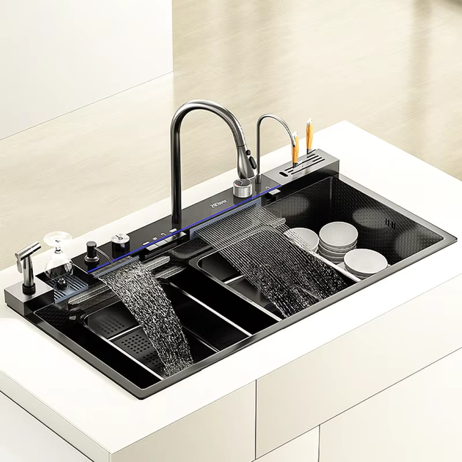 Livin Modern Black Stainless Steel Multifunction Waterfall Rainfall Kitchen Sink